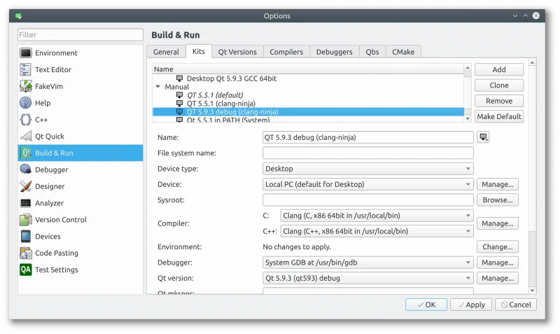 ./configure -prefix /opt/qt593 -debug -opensource -confirm-license -ccache -platform linux-clang