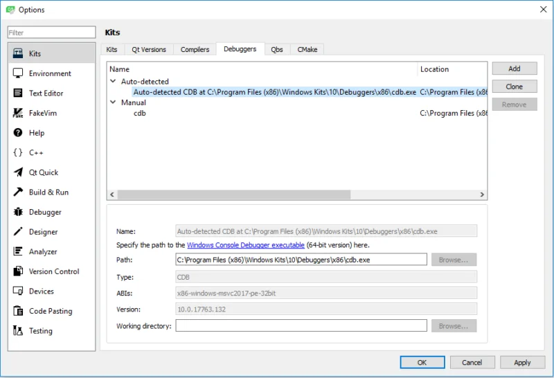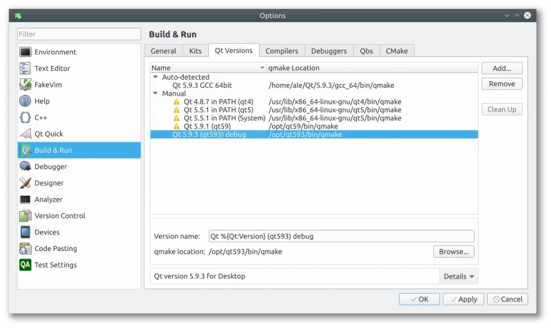 If everything went fine, you can now configure Qt Creator to use this new debug build of Qt: start with creating a new kit (you can probably clone a working Qt5 kit if you have one). What you need to change is the Qt version (the path to cmake) to point to your brand new Qt build,: Pick up a name and choose the Qt version, but before doing that you need to click on Manage… to create a new one: Now you should be able to build QGIS using your new Qt build, just make sure you disable the bindings in the CMake configuration: unfortunately you’d also need to build PyQt in order to create the bindings.   Whe QGIS is built using this debug-enabled Qt, you will be able to step-debug into Qt core libraries! Happy debugging!