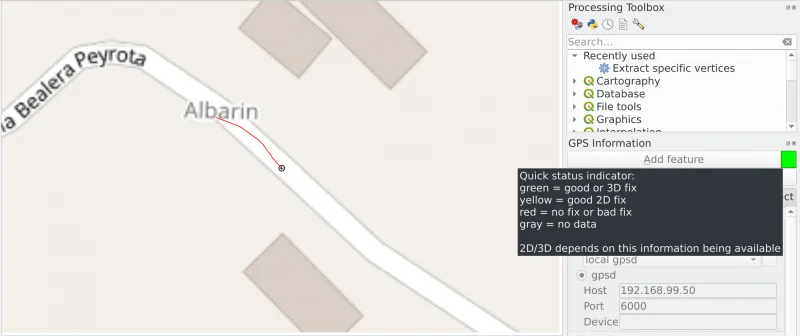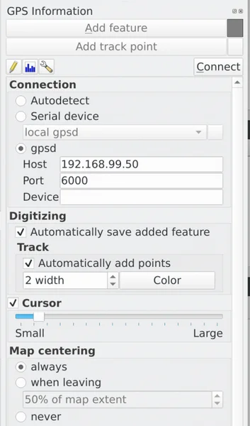 Now, in QGIS you can open the plugin dialog through Vector -> GPS -> GPS Tools and enter the IP address and port of your GPS device:   Click on Connect button on the top right corner (mouse over the gray square for GPS status information)   Start digitizing!