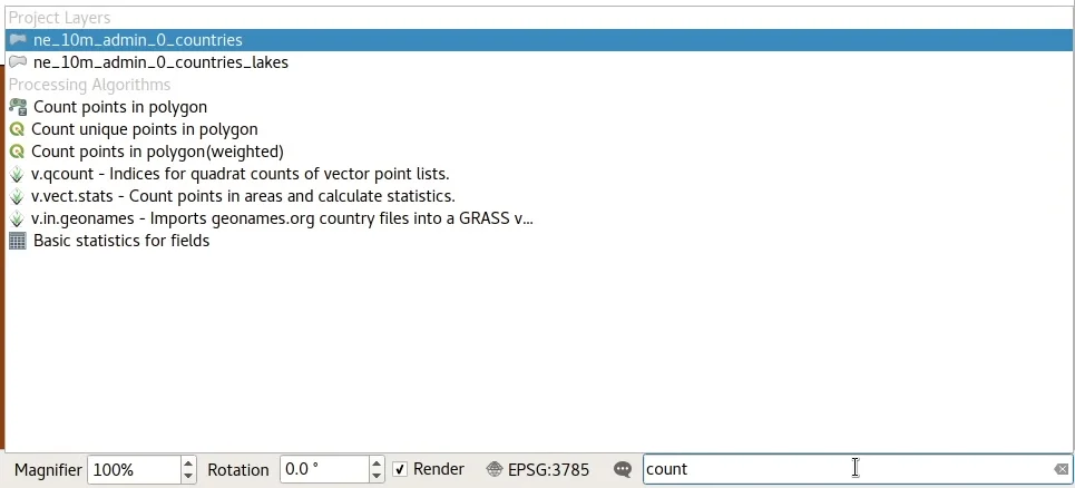 • Lastly, I spent a lot of time on a fun feature I’ve long wanted in QGIS – a unified search “locator” bar. This feature is heavily inspired by Qt Creator’s locator bar. It sits away down in the status bar, and entering any text here fires up a bunch of background search tasks. Inbuilt searches include searching the layers within the current project (am I the only one who loses layers in the tree in complex projects!?), print layouts in the project, processing algorithms, and menu/toolbar actions. The intention here is that plugins will “take over” and add additional search functionality, such as OSM place names searching, data catalog searches, etc. I’m sure when QGIS 3.0 is released this will quickly become indispensable!