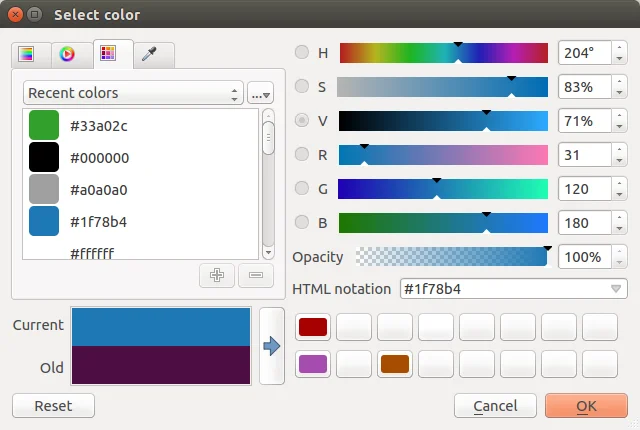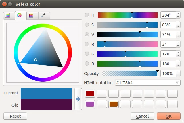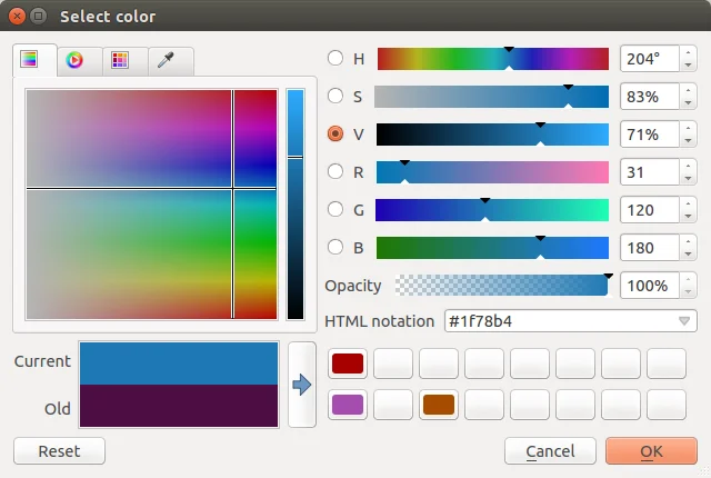 Controlling color is a very important deal for a cartographer and QGIS allow you to control it like the professional you are. You can select your colours using many different interfaces. Interfaces that you might recognize from software like Inkscape, Photoshop, Gimp and others alike.